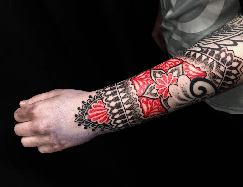 Ich experimentierte mit verschiedenen Farbtönen, nutzte viele geometrische Muster und versuchte, optische Täuschungen zu erzeugen. Es war eine sehr aufregende Zeit, und meine Arbeit wurde aufgrund ihres einzigartigen Aussehens und ihrer Ästhetik in verschiedenen Tattoomagazinen und internationalen Publikationen anerkannt. Digitales Design war damals, zumindest im Tätowieren, noch nicht weit verbreitet, also waren alle meine Designs von Hand gezeichnet, einschließlich des Stipplings, was extrem lange dauerte. Ich habe immer noch meinen kleinen Stapel an Designs aus dieser Zeit.